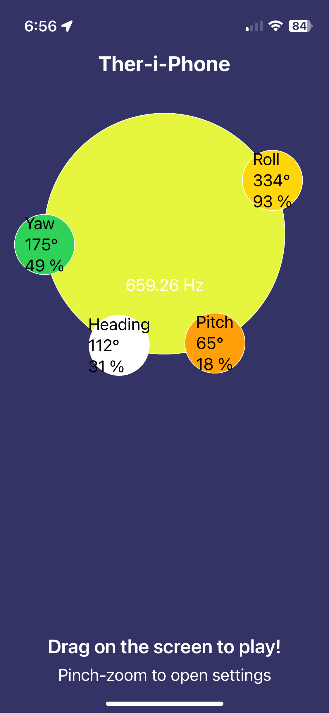 Theriphone uses two oscillators, which can be detuned from each other and/or use the same or different scales and note-ranges. For musical use, pitch can be mapped to vertical or horizontal position on screen. For wilder effects, you can map it to device rotation, or even whether the device is aimed north or south or in between.