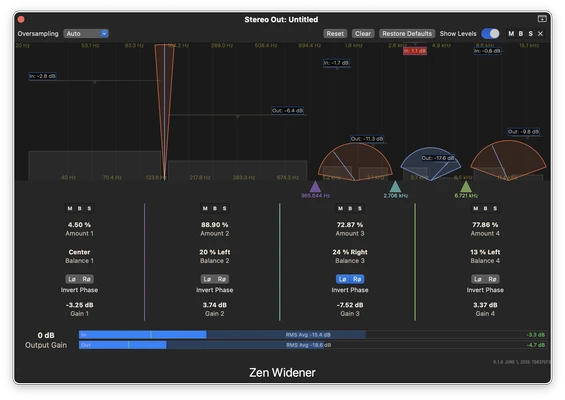 Zen Widener is a multi-band stereo image enhancer that works by subtracting center content from a stereo signal and choosing the center-point.