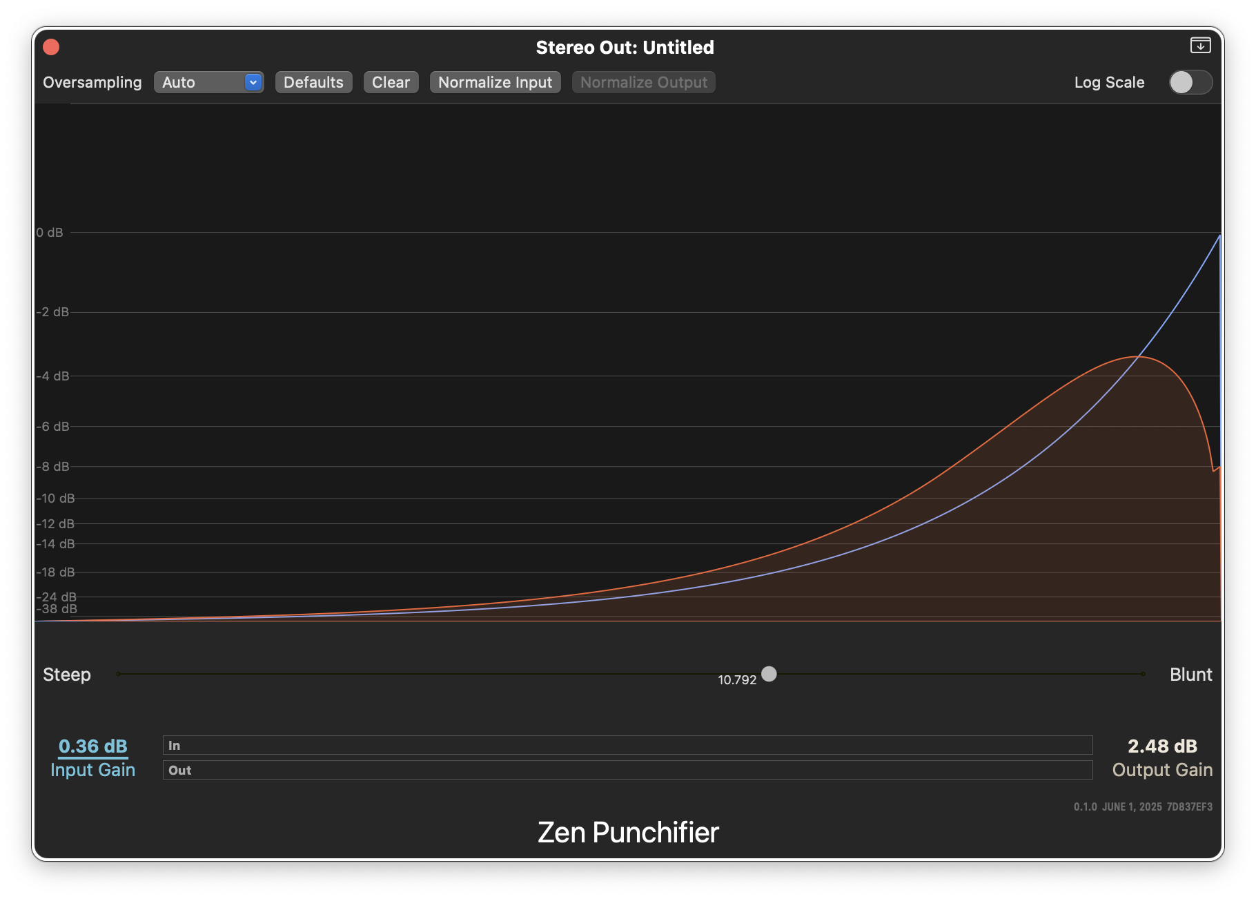 Zen Punchifier really wants signals that go all the way up to 0dB to work its magic; signals that go above that will be gently limited. It is not quite a compressor, not quite a limiter, but a bit of both!